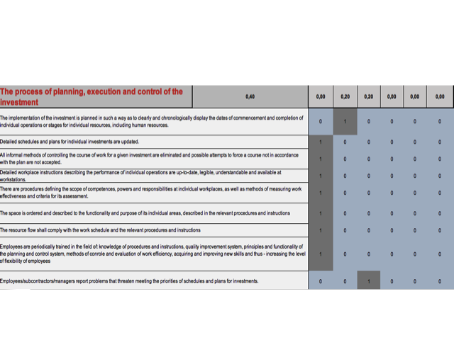In the context of the construction industry, the desire for change and improvement prompted a thorough examination of the company's current development and areas in need of strengthening. Through collaboration with the management board, eight process areas were identified and subjected to initial analysis. These areas include: